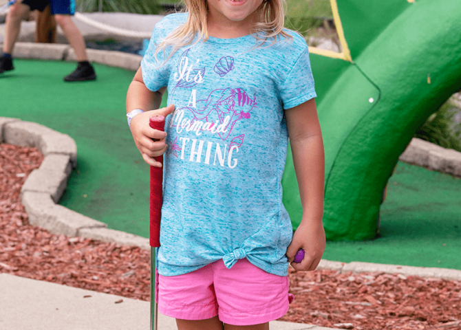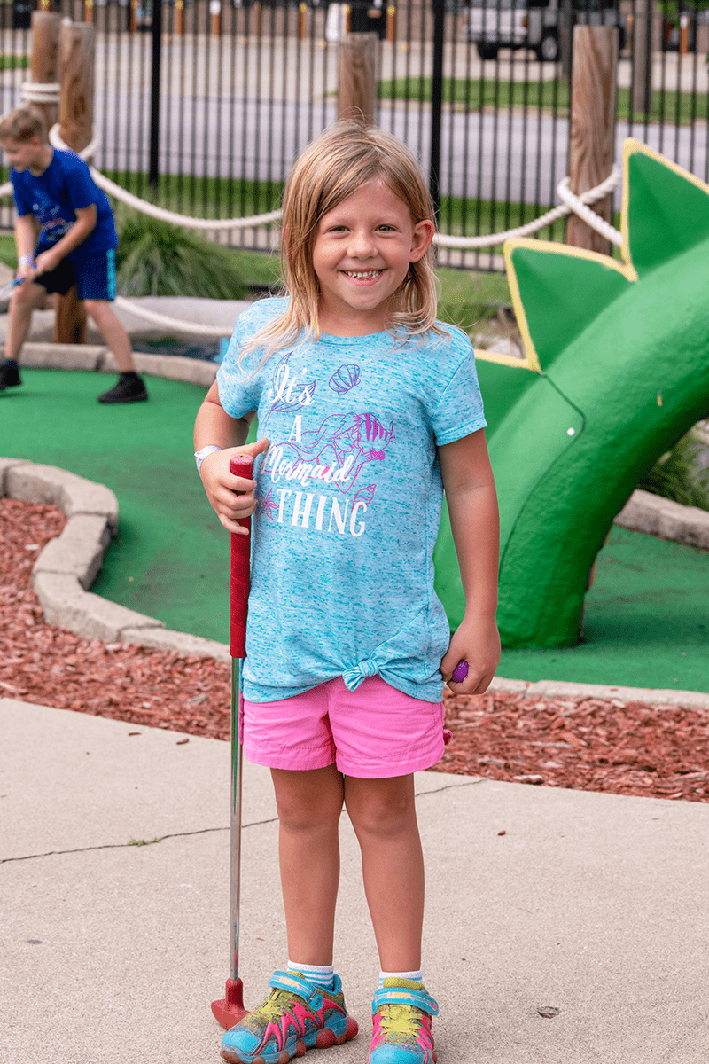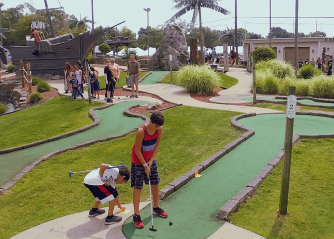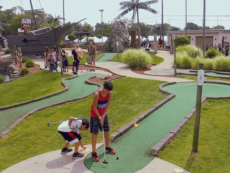 Our 18-hole courses are an adventurer’s dream! Featuring pirate ships, sea monsters, waterfalls, and palm trees, you’ll feel like you’ve slipped into a Caribbean adventure as you play through a scenic landscape. Full of twists and obstacles, our courses are a fun and challenging experience for players of all skill levels!